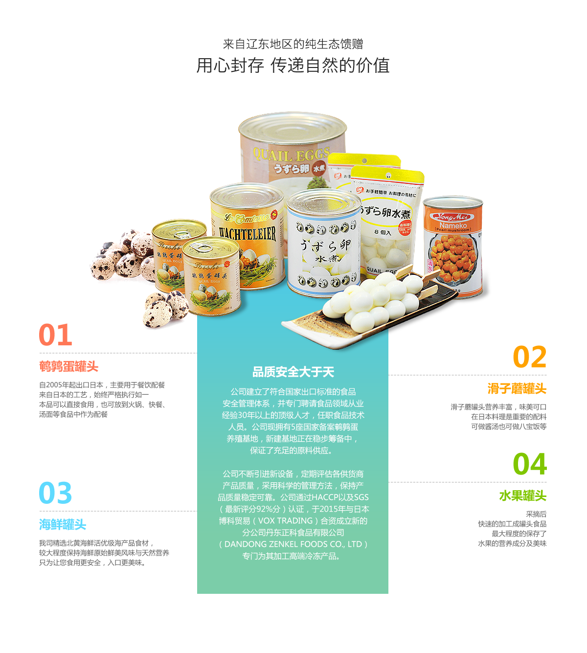 丹東日食食品有限公司是一家專注罐頭及速凍生產(chǎn)的食品加工型企業(yè)。公司主要產(chǎn)品為鵪鶉蛋罐頭、滑子蘑罐頭、冷凍產(chǎn)品等,年產(chǎn)量約5000噸。其中,鵪鶉蛋罐頭出口量位居近年國內(nèi)之冠;滑子蘑罐頭出口量也列國內(nèi)前位。各種產(chǎn)品主要出口日本,并遠(yuǎn)銷德國、澳大利亞、新加坡等國家和地區(qū)。